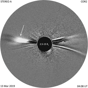 | dc.description.abstract | The distribution of spacecraft in the inner heliosphere during 2019 March enabled comprehensive observations of an interplanetary coronal mass ejection (ICME) that encountered Parker Solar Probe (PSP) at 0.547 au from the Sun. This ICME originated as a slow (~311 km s⁻¹) streamer blowout (SBO) on the Sun as measured by the white-light coronagraphs on board the Solar TErrestrial RElations Observatory-A and the Solar and Heliospheric Observatory. Despite its low initial speed, the passage of the ICME at PSP was preceded by an anisotropic, energetic (lesssim100 keV/n) ion enhancement and by two interplanetary shocks. The ICME was embedded between slow (~300 km s⁻¹) solar wind and a following, relatively high-speed (~500 km s⁻¹), stream that most likely was responsible for the unexpectedly short (based on the SBO speed) ICME transit time of less than ~56 hr between the Sun and PSP, and for the formation of the preceding shocks. By assuming a graduated cylindrical shell (GCS) model for the SBO that expands self-similarly with time, we estimate the propagation direction and morphology of the SBO near the Sun. We reconstruct the flux-rope structure of the in situ ICME assuming an elliptic-cylindrical topology and compare it with the portion of the 3D flux-rope GCS morphology intercepted by PSP. ADAPT-WSA-ENLIL-Cone magnetohydrodynamic simulations are used to illustrate the ICME propagation in a structured background solar wind and estimate the time when PSP established magnetic connection with the compressed region that formed in front of the ICME. This time is consistent with the arrival at PSP of energetic particles accelerated upstream of the ICME. | en |