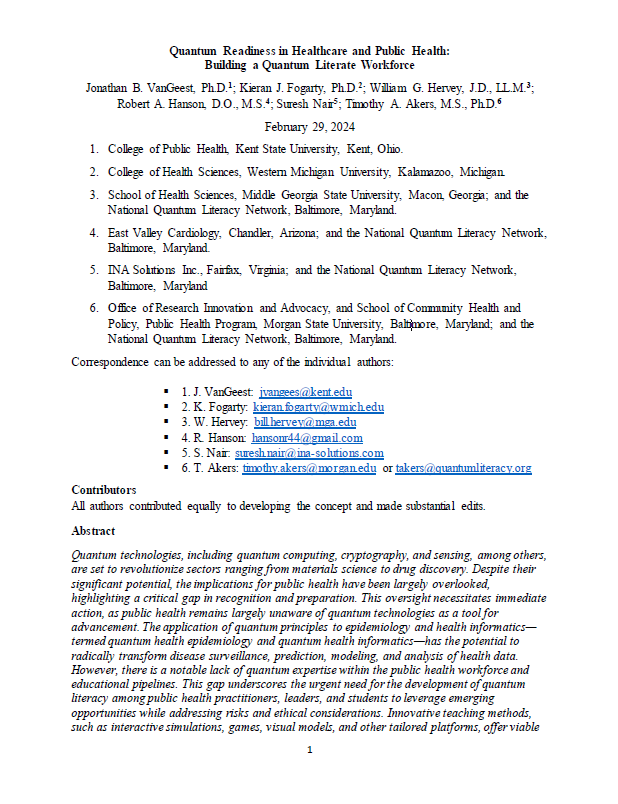 | dc.description.abstract | Quantum technologies, including quantum computing, cryptography, and sensing, among others, are set to revolutionize sectors ranging from materials science to drug discovery. Despite their significant potential, the implications for public health have been largely overlooked, highlighting a critical gap in recognition and preparation. This oversight necessitates immediate action, as public health remains largely unaware of quantum technologies as a tool for advancement. The application of quantum principles to epidemiology and health informatics, termed quantum health epidemiology and quantum health informatics, has the potential to radically transform disease surveillance, prediction, modeling, and analysis of health data. However, there is a notable lack of quantum expertise within the public health workforce and educational pipelines. This gap underscores the urgent need for the development of quantum literacy among public health practitioners, leaders, and students to leverage emerging opportunities while addressing risks and ethical considerations. Innovative teaching methods, such as interactive simulations, games, visual models, and other tailored platforms, offer viable solutions for bridging knowledge gaps without the need for advanced physics or mathematics. However, the opportunity to adapt is fleeting as the quantum era in healthcare looms near. It is imperative that public health urgently focuses on updating its educational approaches, workforce strategies, data governance, and organizational culture to proactively meet the challenges of quantum disruption thereby becoming quantum ready. | |